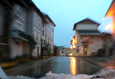 Les lumières des réverbères qui se reflètent sur la chaussée mouillée.