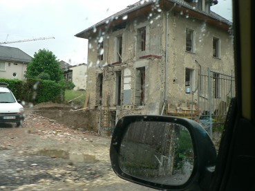 Vision furtive du grand trou devant l’ancien l’hôtel d’Arvillard, dont les ouvriers sont en train de consolider les fondations. Sur la place c’est tout le bas de la nouvelle maison qui est déjà construit : je ne suis pas pressé, je m’arrête pour faire le point sur les travaux. Un peu plus loin il y a une autre maison en réfection, et une autre encore entourée d’échafaudages plus bas. J’aime qu’on refasse les maisons, qu’on prenne soin des vieux murs.