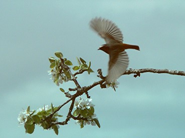 Cela fait quelque temps que le Rougequeue à front blanc semble installé dans le jardin. Posté sur les piquets de la clôture ou sur une branche du poirier en fleurs, il guette les insectes et déploie à perte de champs la « mélancolie voilée » de sa phrase « brève, mélodieuse » mais qui « tourne court, comme si l’oiseau ne savait plus la suite » (on aura reconnu Paul Géroudet).