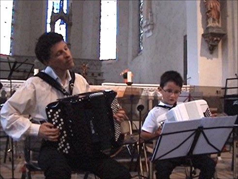 Léo joue, de manière un peu fébrile mais sans anicroche, « Il en faut peu pour être heureux », tandis que l’averse crépite sur le toit de l’église – puis nous jouons le duo que nous avons déjà présenté à Montmélian. « On passe sa vie, dans ce métier, à régler des problèmes techniques » : je m’aperçois en cours de morceau que, occupé à me chamailler avec Léo qui estimait que j’avais commencé l’accordéon en même temps que lui et non après comme je le disais, j’ai oublié de détacher la partie inférieure du soufflet de l’accordéon et suis donc bloqué (c’est à peu près comme rouler avec le frein à main) ; je continue tant bien que mal et parviens à camoufler ce camouflet (je cesse de jouer de la main gauche, mais Léo continue avec brio). L’exécution solo de la chaconne ne me procure pas l’intensité que j’espérais, que je vis si souvent lorsque je joue seul. Il y a néanmoins quelque chose de particulier dans le fait de jouer devant un public nombreux, puisque je rate quand même un passage à la main gauche qui ne pose pas de problème particulier ; je camoufle là encore en improvisant un peu ce petit raté, et me rattrape à la mesure suivante.
