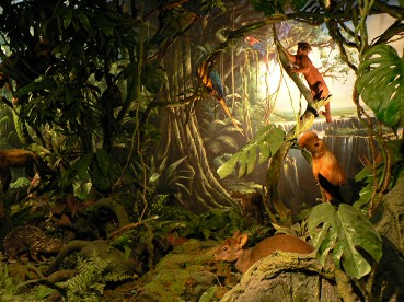 Ici je redécouvre l’Amazonie telle que je l’ai rêvée avant de la vivre, et telle que je la rêve maintenant après l’avoir vécue. Je désigne aux enfants le coendou, le coq de roche, le koati, le kinkajou (tu sais, celui qui m’avait pissé dessus un jour, en forêt…). Je montre aux enfants l’agouti du jardin (rachitique, décoloré, méconnaissable) et l’incroyable coracine chauve, dont l’unique exemplaire exposé au Muséum est finalement moins décrépi que je ne l’ai dit dans L’éloignement (mais il manque le bleu vif de la tête et la force catastrophique de son hurlement dans l’air moite de la forêt tropicale…).