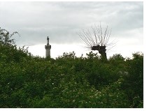 Que les néo-païens et les anticléricaux militants me pardonnent, j’aime (je l’ai déjà confessé) ces signes de la Chrétienté, statues et croix des carrefours ou des cols, en lesquels je vois avant tout des hommages à l’espace. J’aime cette statue qui prolonge la Tour au sein de ce paysage horizontal (que la foudre l’ait déjà frappée n’étonne pas). La silhouette d’un arbre mort lui répond à merveille.