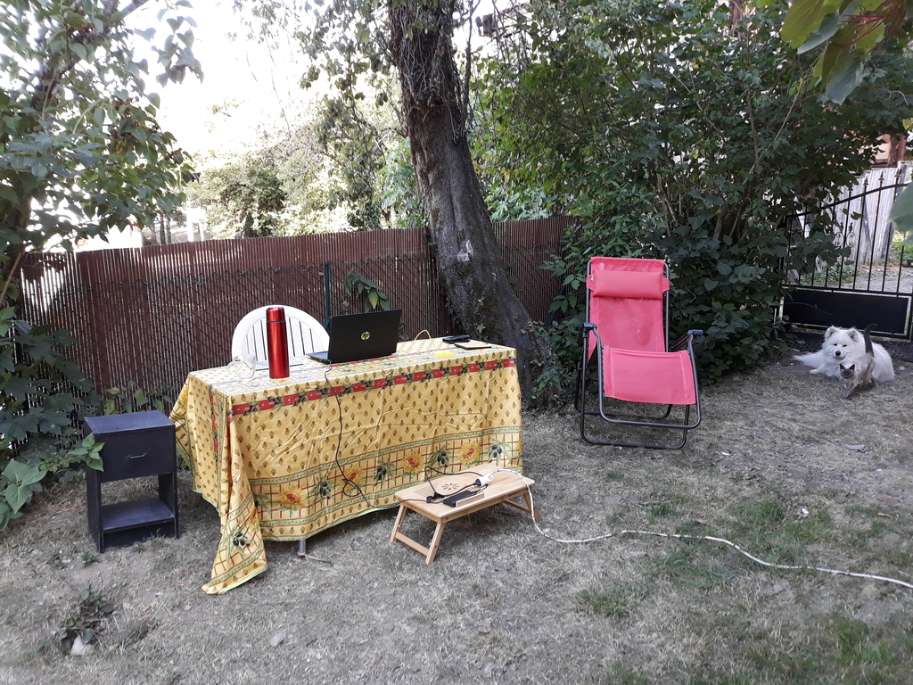 D’ici je peux regarder le ballet des rouges-queues et des bruants, accueillir la visite d’un longicorne, rester en contact avec les autres habitants de la maison et du jardin. Parfois, je m’y installe avec Élodie, qui travaille à son livre de Sao Tomé qu’elle vient de reprendre ou aux préparatifs de son premier marché.