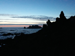 Première marche au crépuscule. Je reconnais la plage où, la dernière fois, nous nous étions photographiés avec un phoque en arrière-plan : un phoque se baigne encore au même endroit, comme s’il n’avait pas bougé depuis onze ans…