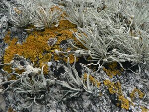 Le rocher. J’aime ce granite rugueux qui accroche bien sous la chaussure autant que j’aime la page lisse du carnet, qui sont l’envers de la même réalité sensible. Au premier plan et côté grève, le granite est gris clair et noir, orné de différentes espèces de lichen : orangé, safran, blanc grisâtre ou vert cendre avec des tubes pareils à ceux des trompettes de la mort qui s’achèvent en une petite excroissance sphérique qui leur confère une allure de plante carnivore, ce qui donne soudain la sensation que le rocher tout entier, comme un banc de coraux carnivores, est en fait un immense organisme vivant fait pour nous avaler et nous digérer si lentement que l’on ne s’en aperçoit même pas. Ici ou là quelques éclats de feldspath luisent comme des dents. Le lichen ras d’un blanc grisâtre, lorsqu’on le regarde de plus près encore, est percé de petites cavités sombres pareilles à des bouches ouvertes. Derrière mon dos une faille où stagne un peu d’eau noire évoque les sucs digestifs de quelque népenthès. Ici ou là tremblent des plumes blanches, des fragments de duvets, comme tremble plus loin une souris grise qui est en train de vivre ses tout derniers instants avant de finir dans le bec du goéland qui l’aurait probablement achevée si nous n’étions pas venus perturber le cours des choses ; et tremble aussi la salicorne en fleurs ou la criste maritime au bon goût de fenouil que j’aime mâchouiller.