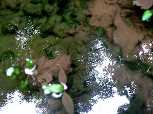 Une flaque dont la boue recouverte d’une fine couche d’algues semble dessiner une carte en relief m’arrête un moment. Les genoux dans la terre je la regarde de près, longtemps, promenade enchâssée dans la promenade comme le sont, à l’intérieur de la flaque, les reflets de la canopée.