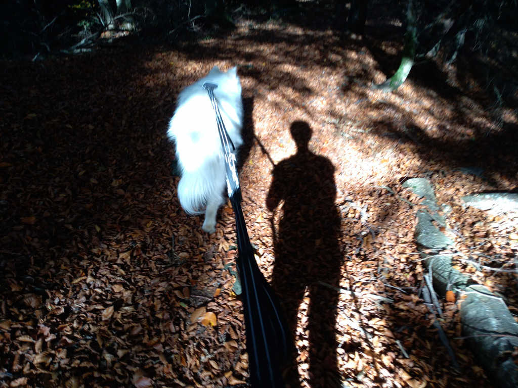 Ainsi cependant, lu ou pas lu, vu ou pas vu, je marche et j’écris dans la joie d’une hêtraie ensoleillée, glissant sur un parterre de feuilles rutilantes et relié au Nordique qui me tracte par bien mieux qu’une longe. Le Nordique en question presse le pas dans la descente, parce qu’il a soif et qu’on arrive à un trou d’eau, puis on dévale sur le toboggan des feuilles, comme deux gosses…