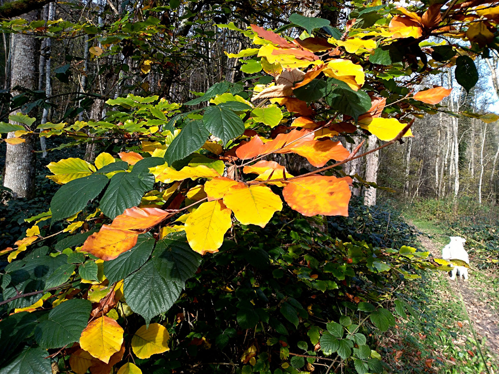 Qui pourrait croire en voyant sur le chemin creux un tel toboggan de feuilles que celui-ci recèle des pièges aussi terribles que pierres qui roulent et bogues qui piquent ? Rimski zigzague d’un bord à l’autre avec une prudence et une timidité qu’il abandonne sitôt passé l’obstacle. À La Martinette, lumière blanche, odeur de punaise et glouglou du bassin. Élodie s’apprête à quitter sa maison pour aller à la déchetterie, les deux chats d’Isabelle sont tapis dans l’herbe et regardent avec effarement le grand chien blanc qui ne les voit pas.