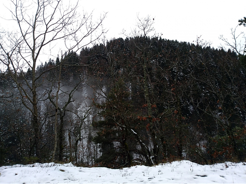 Soudain une branche lourde ploie sur nous et nous blanchit. Par curiosité je m’approche du ravin, pour le cas où des bêtes traverseraient en contrebas : un chevreuil s’est caché à un mètre de moi, qui détale aussitôt.