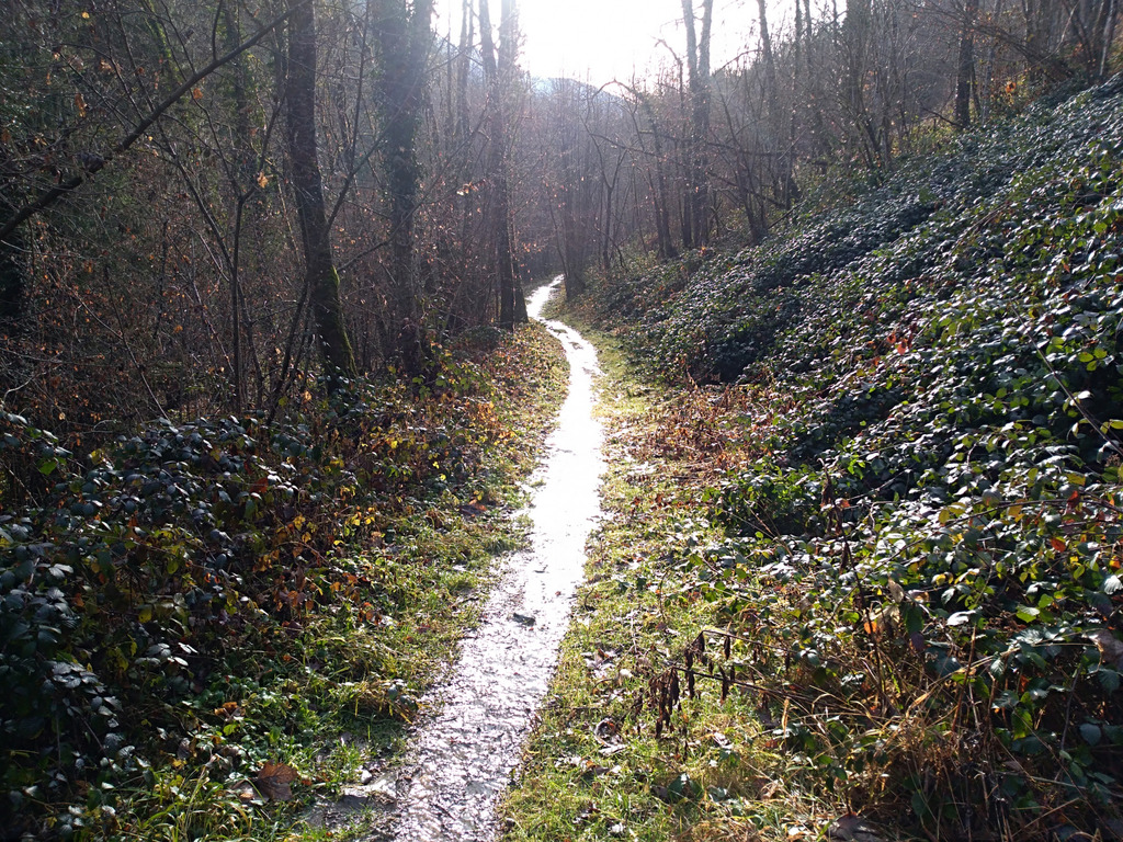 Voici de fait le sentier comme je ne l’avais encore jamais vu, je crois, car l’eau qui ruisselle au soleil en a fait un sentier de lumière. La symbolique de Noël s’en trouve un peu éventée : plus besoin de guirlandes ni de papier doré pour se rappeler que l’hiver de dure qu’un temps. On sait bien que cette douceur excessive, qui va de pair avec une tempête hivernale tout aussi excessive chez nos voisins américains, est l’expression du grand dérèglement en cours ; qu’il me soit néanmoins permis de lui faire dire autre chose que ce qu’elle dit, en quelque sorte de dévoyer son message pour en faire un message de joie et d’espoir tout personnel.