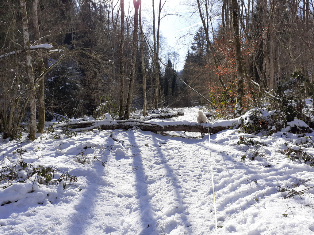 Au bord du grand pré orienté plein sud où la neige a presque entièrement fondu et laisse apparaître l’herbe sombre et même quelques fleurs jaunes, Rimski cependant se roule dans un dernier névé dont il semble se repaître, faisant ainsi les provisions d’hiver et d’ombre dont il aura besoin pour traverser le bourbier du printemps, le désert de l’été.