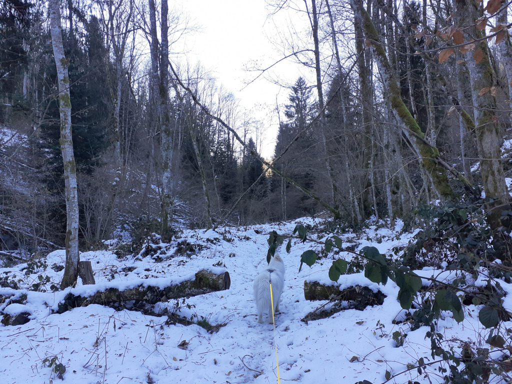 Soudain la boucle qui tenait la laisse cède sous la pression de Rimski, qui peut enfin réaliser son rêve de courir après des chevreuils. Je cours moi-même en montant vers la lumière, hurlant dans l’air encore bien froid du matin son nom qui sonne bien. Comme je le vois s’arrêter et s’asseoir, j’ai un instant l’illusion d’avoir été obéi, jusqu’à ce que je constate que c’est simplement la laisse qu’il traînait derrière lui qui s’est enroulée autour d’un arbre, mettant un terme à sa fuite.