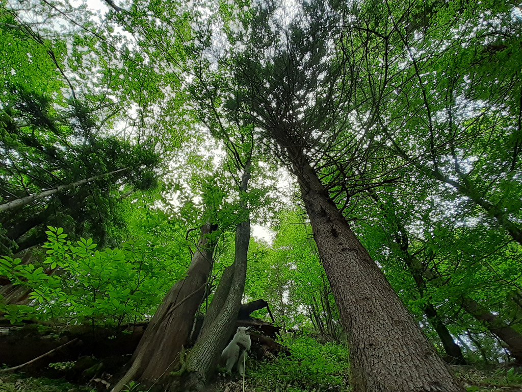 L’orage d’hier a été si violent que la route a été coupée par des coulées de boue. Devant le hangar un escargot traverse le goudron encore trempé – moi, c’est le grand champ aux herbes hautes que je traverse, Rimski bondissant follement pour continuer à y voir quelque chose (je ne sais pas encore que ces jeux dans les hautes herbes seront à l’origine de la blessure qui va bientôt l’empêcher de bondir). Des troupes d’étourneaux et de grives se pressent partout où l’on a fauché. Le ciel blanchit, les nuages s’amassent sur les crêtes et l’on sent qu’à nouveau l’orage se prépare. Le vent humide soulève des parfums d’herbe et de lilas. Soudain Rimski manque briser sa laisse et mon dos à cause de l’écureuil noir qui vient juste de débouler devant son museau et qu’il regarde escalader le tronc du sapin. Les deux pattes contre le tronc, il tente de suivre l’animal puis se retourne vers moi et me lance un cri accusateur : pourquoi ne m’as-tu pas appris à grimper aux arbres ?