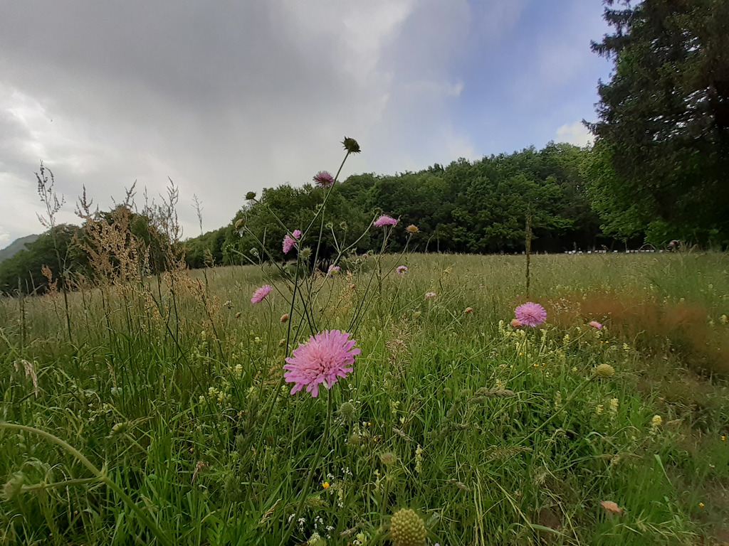 Dernière promenade de mai sous la pluie tiède qui s’intensifie, et je m’interroge sur la couleur des scabieuses, plus vive que le mauve, plus claire que le violet, d’un parme tirant sur le fuchsia ou même le rose, avec des variations plus ou moins importantes d’une fleur à l’autre. J’aime cette couleur incertaine de scabieuses, mais plus encore le violet pur des raiponces dont les bouquets hirsutes s’épanouissent tout au long du sentier. C’est la couleur de mon obsession du moment – car je me suis mis en tête (avec cette propension à transformer en problème métaphysique une énième lubie vestimentaire), pour la lecture publique qui doit avoir lieu à Chambéry en juin, d’assortir les couleurs de mes vêtements à celles de la couverture du livre Entre deux gares, ce qui m’a d’ailleurs permis de constater que cette association entre le violet et le bleu ciel que je trouve si réussie est très rare dans le prêt-à-porter, et qu’il n’est en outre pas facile de trouver un pantalon violet pour homme. Dans ce paysage où les verts partout paradent, ruissellent, s’imposent, je cherche à travers les scabieuses, les raiponces, les admirables géraniums à tige noueuse, les trèfles, les silènes, les évanescents pigamons à feuilles d’ancolie (que l’on croirait tissées par quelque araignée psychédélique), tout ce qui va du bleu au rose en passant par le violet, le mauve, le fuchsia, sans parvenir à trouver la nuance idéale.