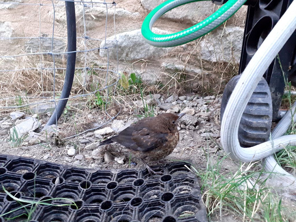 C’est une période heureuse et triste que cette mi-juillet où les oisillons prennent leur premier envol alors qu’ils ne savent pas encore vraiment voler. Hier une jeune pie a atterri devant la fenêtre de mon bureau au premier étage ; elle a crié, tapé du bec à la vitre, puis est repartie sans encombre sur le poirier. Sur les deux fauvettes à tête noire qui sont venues percuter la porte du séjour, l’une est morte, attrapée par un chat, l’autre est repartie se cacher dans l’actinidia. Ce matin, c’est une jeune grive que je trouve devant la porte du jardin, incapable de repartir. Je la prends dans mes mains mais elle se débat. Je l’aide à se cacher dans les buissons, mais les chats rôdent, pour lesquels elle est une proie toute désignée. Pauvre grive ! on est en sécurité nulle part, je pourrais faire un roman de quatre cents pages sur ce thème !