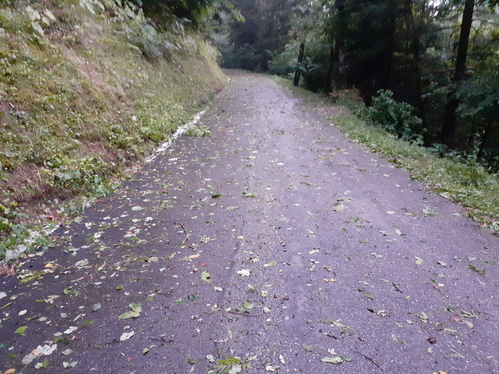 Depuis le passage de la tornade le temps est d’un étrange automne, avec toutes ces feuilles chues sur la route et le chemin dont les couleurs sont pourtant celles, vert sombre, du plein été. La température a chuté de dix degrés, et l’on voit bien que la forêt peine à se remettre. Les arbres y ont laissé des feuilles, les escargots des coquilles, les oiseaux des plumes, les mammifères des poils : on en trouve des touffes ici ou là, et des cadavres de rongeurs assommés ou noyés. On se fraye un passage sous les arbres abattus qui recomposent un nouveau parcours. Ainsi cette petite catastrophe finit-elle par participer à ce renouvellement des perceptions qui nargue le possible ennui de la répétition.