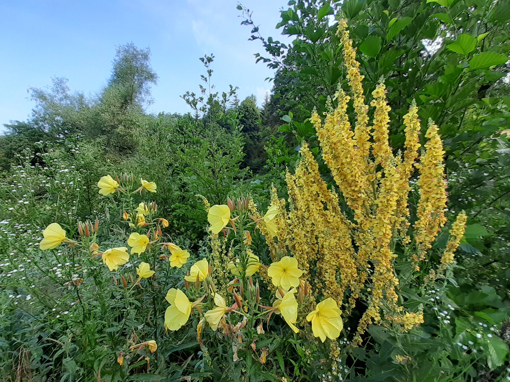 C’est d’ailleurs le cas. Les meules que je voulais photographier à l’instant où le soleil éclaire la partie supérieure du Pic de l’Huile ont été emportées, il me faudra me contenter des images décevantes d’hier et j’ai manqué ma chance. Je me rabats sur des images de bouillon noir (ce n’est pas pour suggérer que je bois un bouillon déprimant, c’est le nom de cette haute plante couverte de fleurs jaunes qui pousse le long du chemin), puis sur les filaments jaunes (jaunes comme le bouillon noir) des fleurs de châtaigniers qui jonchent le sentier ou sur les hémérocalles orange qui sont en train de griller paisiblement devant la façade d’une maison. Ainsi se compose quand même mon tableau coloré de l’été.