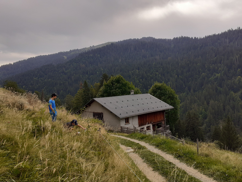 Finalement, j’ai quand même retrouvé ce chalet du Fardellet, après quelques hésitations. Le champ m’a semblé plus fermé mais les chardons sont toujours au même endroit et, hormis le vieux merisier dont il ne reste plus qu’un moignon et le bassin où l’eau ne coule plus, rien n’a changé. Comme il n’y avait personne, Clément, Léo et moi nous sommes abrités de la pluie pour manger avant la montée. J’avais oublié qu’il y avait toutes ces fermes, tous ces chalets le long du chemin qui va de la maison au Chemin des Stalés. Léo et Clément ont marché assez gaillardement, malgré le lever trop matinal, et se sont pris au jeu de l’identification de criquets.