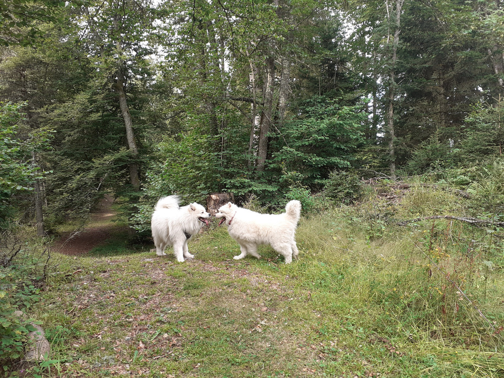 Hier, justement, dans l’hier de la vie, je suis allé aider Élodie à l’un de ses marchés, en emmenant Rimski avec moi parce que je m’étais dit que sa présence lumineuse attirerait l’œil du chaland sur le stand. Je n’avais pas tort. La présence d’un samoyède pas du tout habitué à la foule a constitué une attraction de choix. Chaque passant qui lui parlait, chaque chien qui passait était l’occasion de jappements suraigus, le sommet ayant été atteint quand un autre Nordique est arrivé. Ils se sont reconnus, ont poussé des cris de loup, et je crois qu’aucune force n’aurait pu les empêcher de se rejoindre, de s’agripper et de se mettre à jouer comme les demi-loups qu’ils demeurent dans l’allée du marché redevenue à leurs yeux une steppe neigeuse où les fantômes humains n’étaient plus que des silhouettes d’arbres.