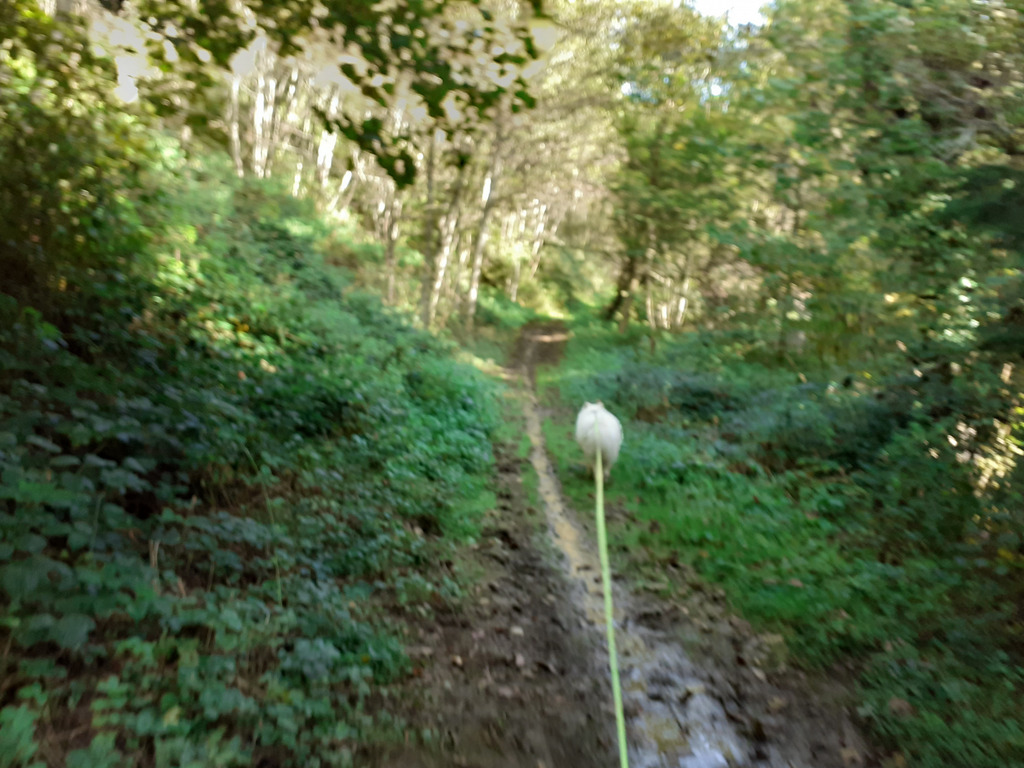 Flairer, flairer, flairer, lécher le bâton tombé en travers du sentier, rejoindre le torrent, regarder l’autre rive, contourner par le pont en flairant les orties, remonter, plus de tension, queue enroulée en panache, flairer une à une les feuilles du roncier, les orties, puis marquer. Un regard vers le maître, pourquoi il parle seul ? Repartir. « Rimski au pied » dit le bipède alors, demi-tour immédiat, s’asseoir, prendre la friandise qui ne se refuse pas, puis reprendre le fil interrompu de la course.