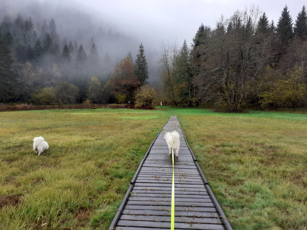 Sur le chemin du marais, Nouchka lâchée gambade en narguant Rimski qui s’est placidement laissé harnacher pendant qu’elle bondissait du coffre de la voiture en déjouant ma vigilance. Je patiente pour lui remettre la longe, conscient de ce que toute tentative ratée prolongera le jeu. Nouchka en liberté n’est plus la même chienne : elle qui passait son temps à renifler en arrière, gambade en tête, fait des cercles fous autour de nous et des sprints qui laissent Rimski plus perplexe qu’envieux (c’est en tout cas ainsi que j’interprète sa mine). On traverse le terrain découvert du marais, où il n’y a personne et où l’on voit le chevreuil éventuel d’assez loin ; puis je rattache la chienne à Rimski avec l’accouple, un peu à regret, bien décidé à recommencer quand elle répondra un peu mieux au rappel – perspective que son peu d’appétence pour les friandises rend très hypothétique. Quelquefois il me semble que l’éducation d’un samoyède relève de l’éducation féline plutôt que canine, autant dire de la gageure. Hier j’ai appelé Rimski, qui est assez accoutumé aux friandises pour être venu aussitôt. J’ai ensuite appelé Nouchka et obtenu d’elle une légère oscillation de l’oreille droite – à part ça, une statue. J’ai alors appelé de la même façon la siamoise Dana, obtenu d’elle la même oscillation d’oreille, mais c’est Nouchka qui est arrivée à sa place. C’est un premier pas : pour faire venir Nouchka, il faut appeler Dana, mais cela ne fonctionne pas toujours et suppose la proximité de la chatte…