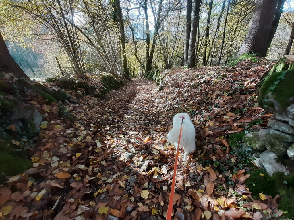 Nouchka ne manifeste cependant aucun dépit, qui trottine près de moi sans tirer sur la longe en humant et savourant tout ce qui peut l’être. Moi, je me sens divisé bien plus que je ne le suis quand ils m’écartèlent l’un et l’autre entre deux directions opposées, car une part de moi est restée dans l’enclos du jardin et attend le retour de sa moitié. Si la salamandre traversait maintenant mon sentier (ce que le temps toujours pluvieux et doux rend possible), j’en serais contrarié : je ne suis pas dans l’état d’esprit qui permettrait de l’accueillir. Il y a en arrière-plan de toutes mes promenades cet impératif moral qu’en l’occurrence je n’arrive pas à toujours respecter, de se mettre dans une posture mentale d’accueil pour le cas assez improbable où le signe espéré de la salamandre surviendrait (que la grenouille qui vient de sauter sur ma botte me pardonne, ce n’est pas elle que j’attends) ; je vis d’autant plus mal toute balade minée par des soucis.