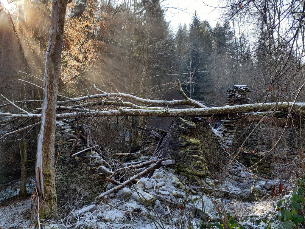 Saisissante est cette image de la ruine, aujourd’hui, sur laquelle un grand arbre s’est abattu il y a maintenant deux ans : comme le givre le souligne d’un trait blanc on ne voit plus que ce tronc dont on croirait qu’il vient juste de tomber, car ce soulignement réitère le geste volontaire qui l’aurait fait s’abattre, « prends ça dans tes murs, espèce de ruine, que je te ruine encore ! », et cette façon involontaire qu’a le givre de ranimer ce tableau auquel je ne prêtais plus tellement attention me fait comprendre à quel point il est faux de dire, comme le fait sépulcralement Catherine Ribeiro dans Le temps de l’autre, qu’ « on ne construit pas sur des ruines » alors qu’on ne construit que sur les ruines, n’importe quel chablis en forêt vous le dira !