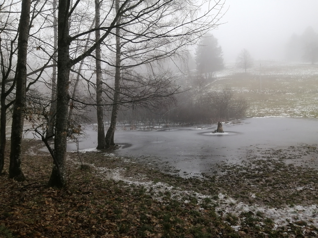 Ici il n’y a pas de drame, juste la bruine qui crépite sur les vieilles feuilles du dernier automne et les toits du hameau désert où pas une lampe n’est allumée, où il n’y a personne aux fenêtres, juste un très léger trait gris-bleu qui tremblote verticalement au-dessus des maisons habitées. On se laisse aller en descente, puis on retrouve la dynamique de l’attelage en montée, les dentelles noires des branches nues dans le ciel gris, l’impatience des torrents, le héron gris au vol étrangement silencieux, et tout cela s’achève dans une petite averse de neige fondue sonore et molle.