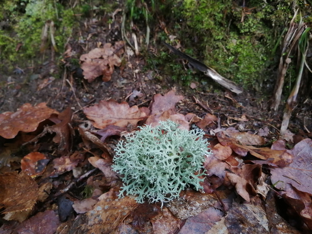 Toutes les bêtes et les plantes sont branchées sur la même fréquence de « radio printemps précoce ». Ce ne sont pas seulement les prés mais aussi les sous-bois qui reverdissent, par-delà le sentier bordé de primevères. Après la brève averse matinale, les chants des passereaux résonnent de plus belle. Je jette un coup d’œil vers la maison aux volets bleus, puis m’engage sur le chemin des chênes qui mène à la forêt le long du mur en pierre qui renvoie la chaleur. À l’orée du bois, m’arrête cette image d’un lichen posé comme une offrande, gris vert très clair, très lumineux, que j’associe à quelque chose de tendre, de rassurant, de réparateur. Je prends son portrait puis je continue.