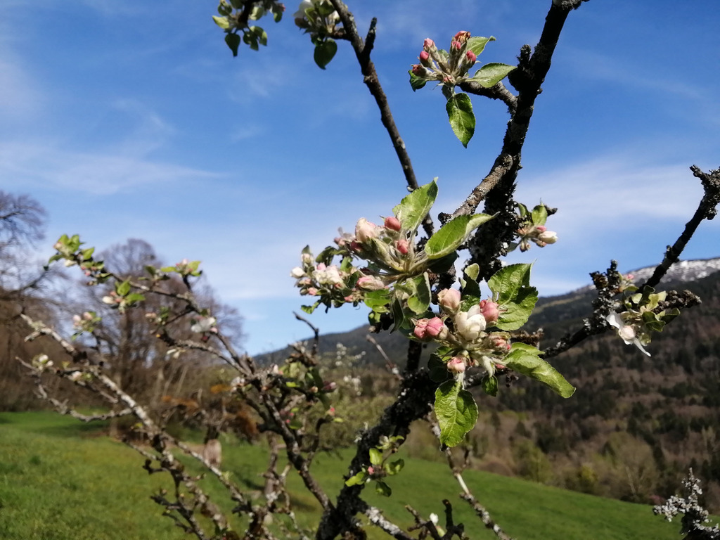Ayant emprunté un chemin imprévu, m’est apparu soudain le rose et blanc prodigieusement tendre des premières fleurs d’un pommier. Aussitôt j’ai senti que je frôlais l’un de ces discrets sommets de nos vies où tout soudain s’équilibre, s’harmonise, où l’on perçoit avec une évidence qui nous est le plus souvent refusé des échos, des couleurs, des appels qui se répondent, comme le rose et blanc des fleurs du pommier s’accordait aux couleurs de Nouchka, qui porte un harnais rose, et plus profondément à ce moment d’infini soulagement d’être arrivé indemne aux premières heures des vacances.