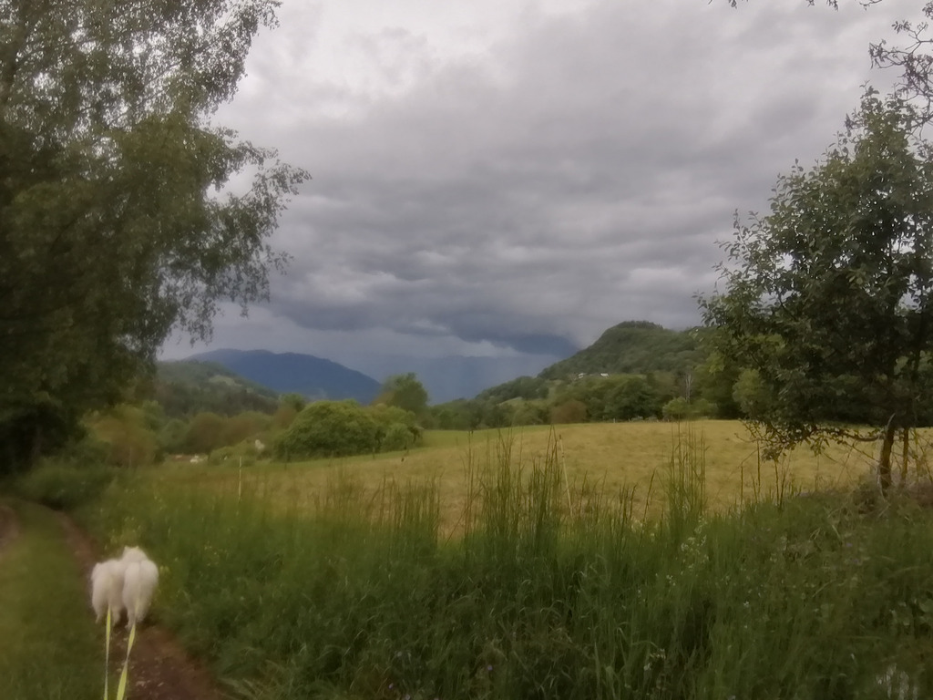 Enfin, il va se passer quelque chose. Ce n’est pas tant l’arrivée imminente de l’averse qui remet de l’aigu dans l’attention bien émoussée de ces derniers jours au lieu de la mollesse, des paroles en place du silence ; ce n’est pas seulement parce que le bleu gris des masses nuageuses accumulées au-dessus de la Chartreuse fait ressortir les verts profonds de ce début d’été trempé, embellissant le paysage d’une façon tout de même sidérante : le temps tout au long de ce mois de mai a été si pluvieux qu’on peut difficilement considérer une averse comme un événement remarquable. Ce n’est pas non plus la joie tonitruante des chiens quand on repart ainsi en promenade : joyeux, ils le sont avec la même constance qu’ils mettent à traquer les odeurs animales au long du sentier.