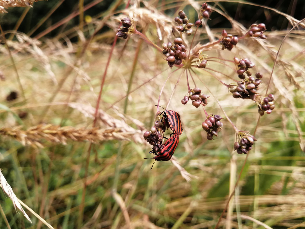 Au matin ensoleillé je repars avec mes chiens sur le chemin habituel, savourant les jeux de lumière et d’ombre du levant dans la forêt au-dessus du nant, photographiant les orthoptères, les araignées ou un accouplement de punaises rouges dans les herbes jaunes. Je reprends l’ancien trajet pour éviter l’inquiétant campement à la tête de sanglier tranchée, sinistre trophée qui annonce la probable colonisation des lieux par quelque horde scoute, comme l’an passé. J’ai eu grand plaisir à prendre le chemin du bas pendant ces derniers mois, j’ai grand plaisir à reprendre celui du haut, avec cette descente glissante juste au-dessus des chutes – chute d’eau rendue terrible par les orages incessants, chute d’humains toujours possible car les chiens sont en forme. Quelqu’un chante, dont on entend à peine la voix couverte par le fracas du torrent. Les impatientes sont en fleurs et me dépassent, penchées sur le sentier rétréci. D’autres voix remontant du passé s’immiscent dans le monologue du torrent. Un gros escargot de Bourgogne se replie dans sa coquille à notre approche. Puis on remonte la côte qui ramène au village, à chaque pas l’air tiédit et l’on n’entend bientôt plus la clameur du nant ni des fantômes.