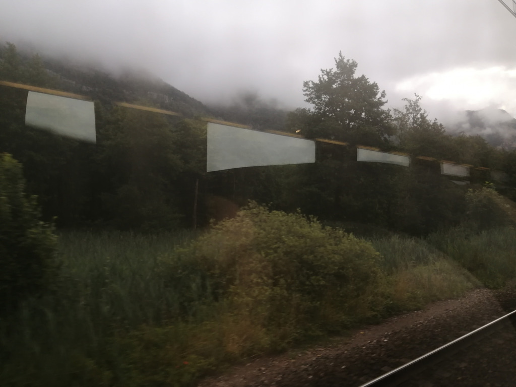 Puis l’on file, aspiré par l’arrière (puisqu’assis dans le sens contraire de la marche) dans un décor banal de buddleias, de bouillons blancs, de bulles et de bouddhas dorés, laissant là les chantiers aux grandes grues et la chaîne de l’Épine. Le grésillement de l’attente cède la place au souffle continu du train et au monologue de la femme africaine dont la langue inconnue me transporte des années en arrière, des kilomètres en avant, jusque dans l’avion Cayenne-Maripasoula où j’entendis naguère pour la première fois parler la langue du fleuve… Le soleil se lève sur la Chartreuse et puis, l’instant d’après (il y a dû y avoir une ellipse solaire) il inonde la campagne rase de sa lumière blanche. Un canard s’envole sur un petit lac sombre au bord duquel campent des pêcheurs (ou pêchent des campeurs), peu avant La Tour du Pin…