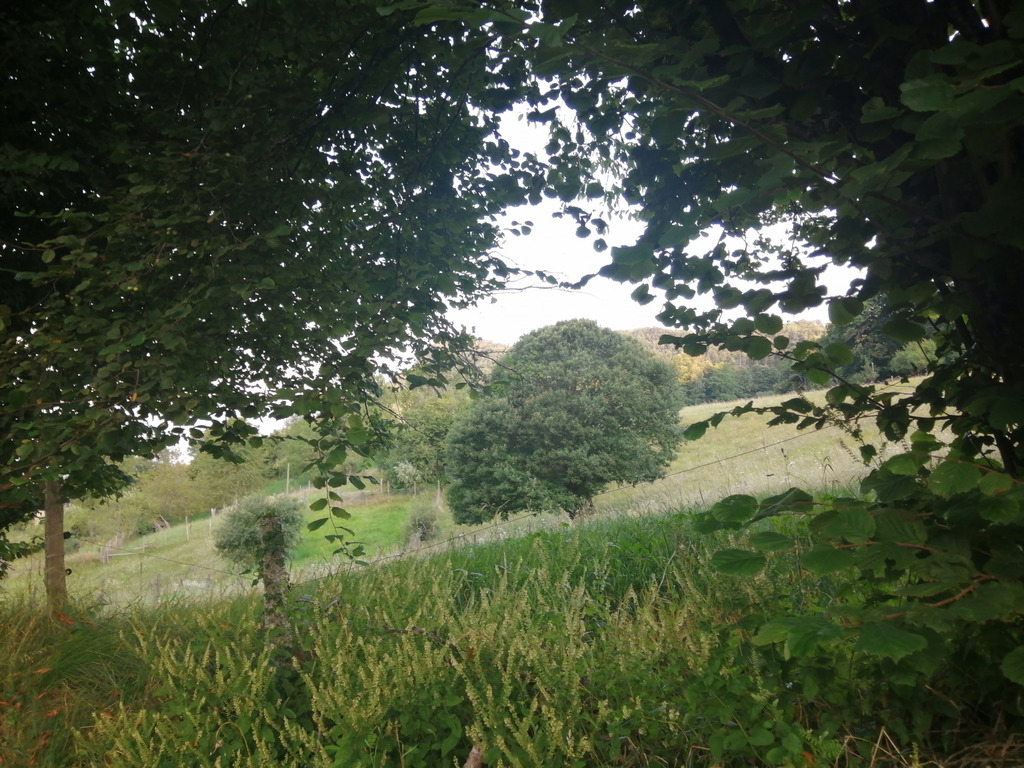 Dans la nuit une averse assez intense rafraîchit l’atmosphère, si bien qu’au matin tout paraît reverdi. Au pied des troncs les rejets des châtaigniers semblent poussés d’hier, vert tendre tout luisant dans la lumière précise que tamisent quelques nuages. Curieusement, parce qu’il est seul au milieu du pré dont les hautes herbes ont jauni, le grand châtaignier rond que je photographie presque tous les jours a pris quant à lui une tonalité plus automnale, que je retrouve aussi dans cette image des pommiers dont les fruits ont spectaculairement grossi et sur le chemin creux jonché de feuilles mortes et de noisettes. C’est toujours ainsi, la première semaine d’août marque le dernier mouvement de l’été, le premier de l’automne, avec des nuances différentes suivant les années et les jours.