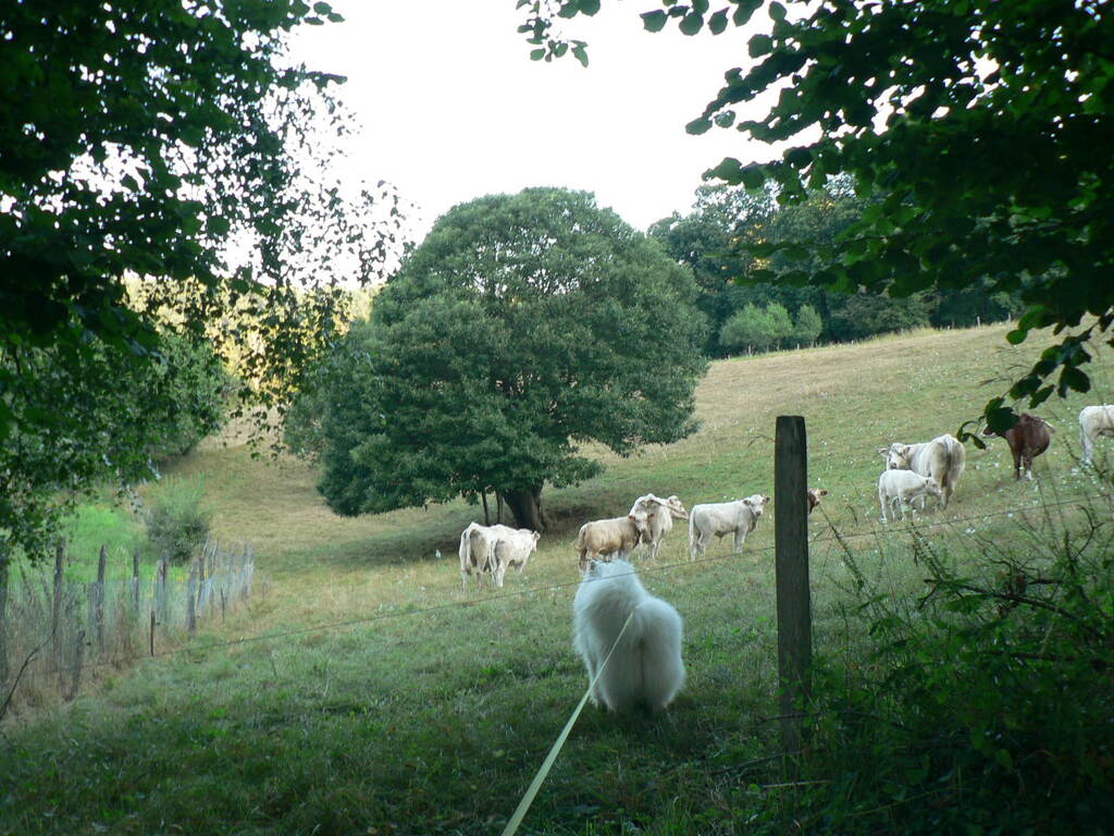 « À l’abade » ne veut pas dire « en liberté », juste au dehors pour une divagation ordonnée ; mais quand même, courir à toute force et se jeter dans le ravin en oubliant l’attache pour courser l’écureuil ne se refuse pas – puis, quand la longe s’impose, aboyer rauque ou aigu pour protester.