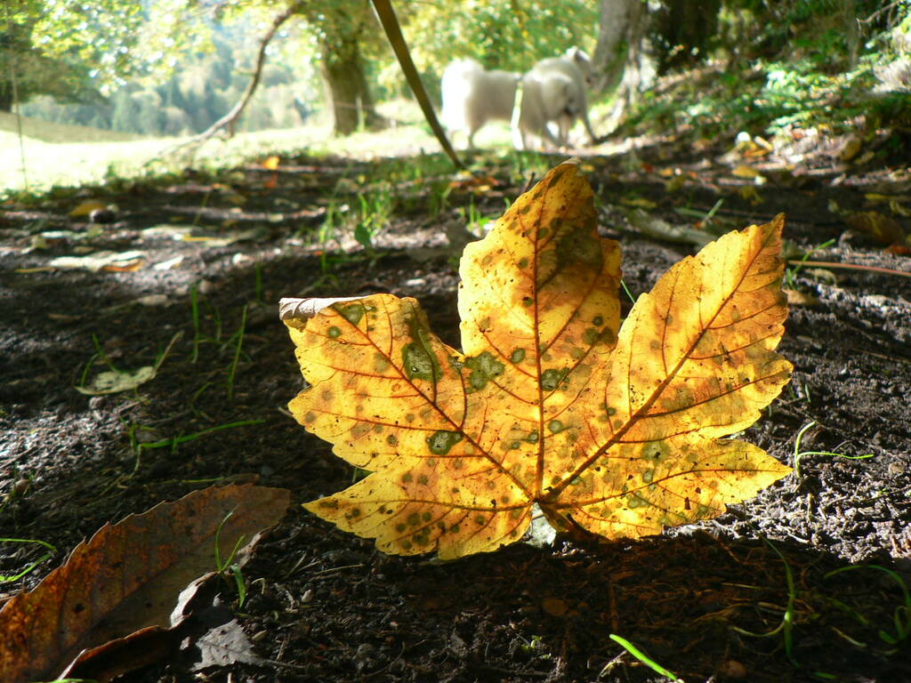 Comment va l’automne en octobre ? Il va, il vient, il flâne, il verdoie encore dans les prés là où le soleil de fin d’après-midi règne encore, au bout du tunnel des noisetiers et sur le tronc moussu du grand châtaignier à la branche cassée. Il châtoie dans les sous-bois où les fougères roussissent de jour en jour. Il a même permis ici ou là la repousse d’un gazon frais tout à fait printanier, et il lui revient des velléités d’été quand on repart à travers champs à la rencontre du grand soleil de face.
