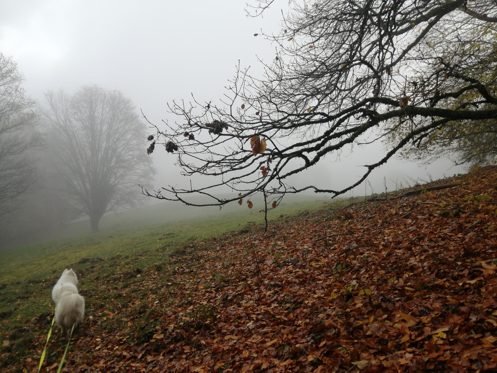 Marche paisible à travers le temps gris. Je salue de loin la tâche noire et blanc de mon chat Musique, en vadrouille lui aussi, et qui m’aurait bien suivi s’il n’y avait les chiens. Les chiens, eux, lapent délicatement les bouses fraîches des vaches qui ont déserté depuis peu le grand pré d’en haut pour regagner celui du bas (on entend leurs clarines).