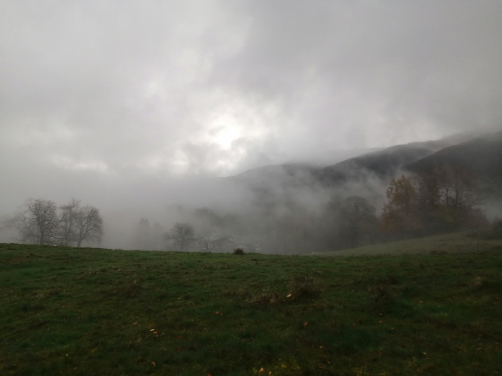Depuis que le brouillard est remonté, le froid qui stagnait en fond de combe a gagné la vallée des Huiles. On s’arrache à la tiédeur du bureau et on repart marcher à travers cette grisaille froide.