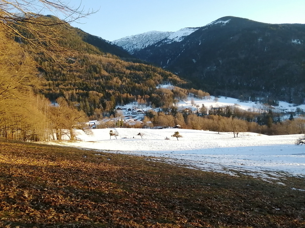 La lumière rasante éclaire encore le village d’une lumière chaude partout creusée d’ombre. Sur le pas de sa porte le voisin parle de son accident. La neige est criblée d’abeilles mortes. Pour la troisième fois le chat Plume ramène le rouge-gorge trouvé raide dans la neige, et grogne quand on s’approche. Hier, c’est un bois de cerf que Rimski a ramené en triomphe (je le lui ai échangé contre une friandise et la relique a rejoint ma collection).