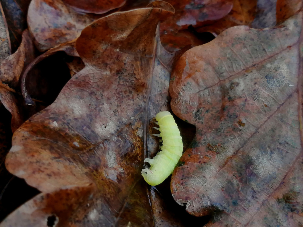 La pluie cependant redouble, je suis parti au pire moment après un trop long temps de lecture. Défi dérisoire à la face du monde, sur les feuilles de chêne sombres et trempées qui jonchent le sol se tortille la petite chenille vert jaune presque fluorescente d’une noctuelle : ses heures, ses minutes, assurément sont comptées, sans que l’homme cette fois n’y soit pour rien !