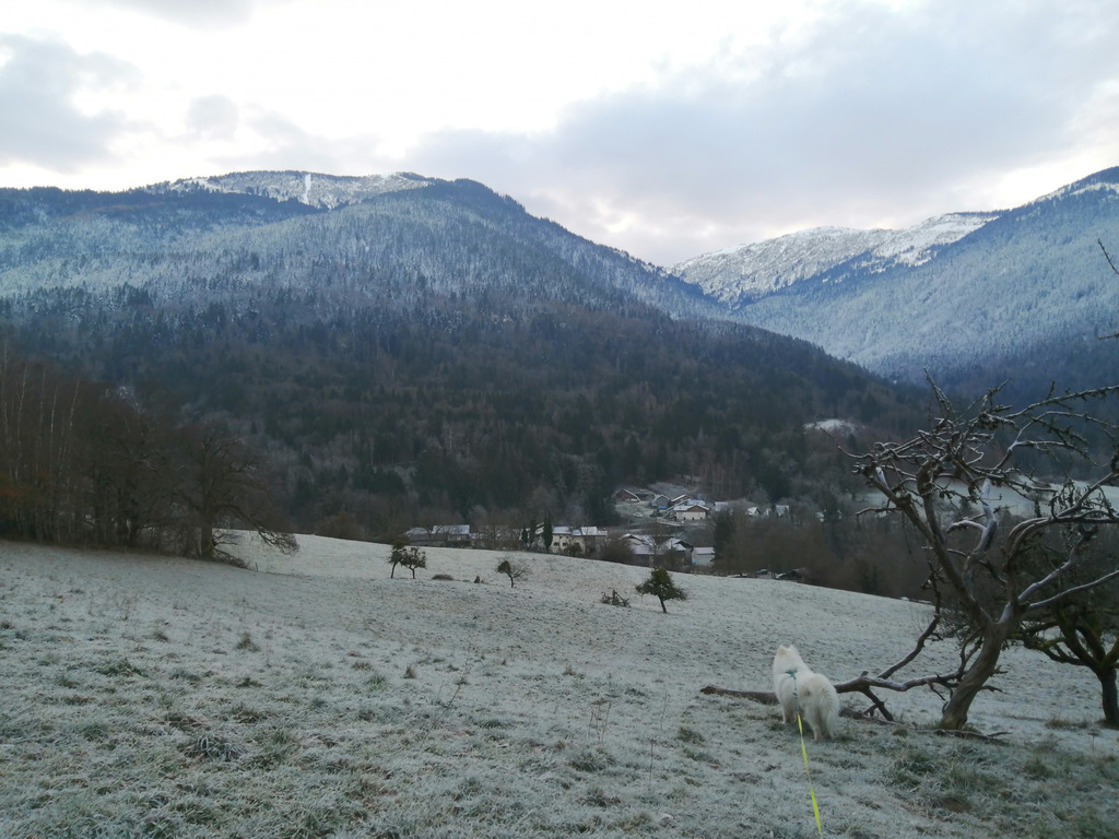 Le paysage ici est objectivement grandiose, l’énorme masse blanche de Belledonne contrastant admirablement avec les prés verts ensoleillés et la combe prise dans l’ombre bleu gris, mais je ne garde en tête que les hurlements des chiens et l’image du jeune chevreuil caché.