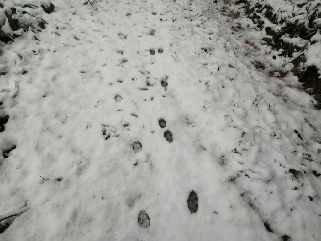 Puis voici la trace d’une martre, je dirais de « la » martre – celle que je vois souvent se cacher un peu plus loin et s’enfuir dans un arbre auquel, en effet, mène la trace. Ainsi se trouvent mêlées les traces des animaux domestiques, sauvages et humains.