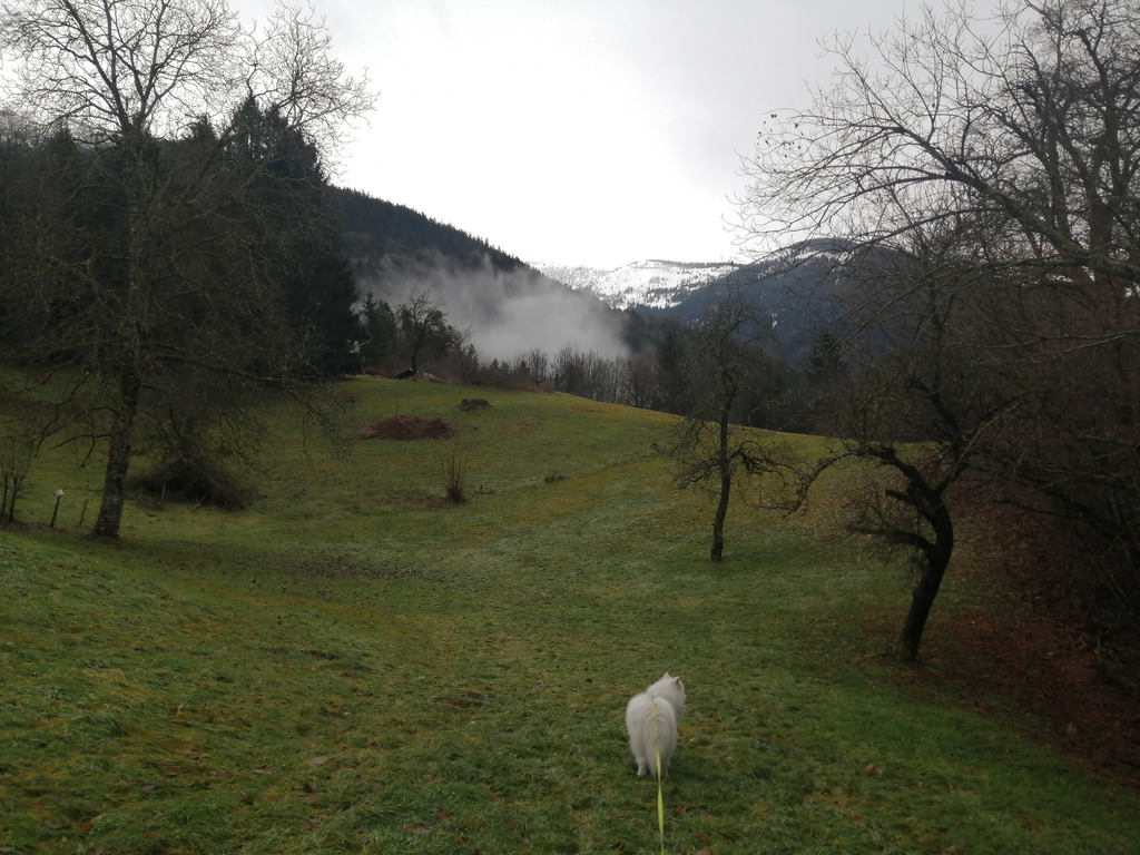 Aujourd’hui encore tout le fond de vallée baigne dans une mer de coton trempé, à travers laquelle j’imagine qu’on ne voit pas à vingt mètres. Sur les hauteurs où je flâne, il fait simplement très gris, très humide, la pluie martèle les feuilles mortes amassées en lisière sur la terre retournée par les sangliers qui ont encore agrandi leurs labours. La gouille déborde d’une eau nouvelle, très sombre, dans laquelle se reflètent les longs et minces troncs gris clair des bouleaux, et qui contraste avec les plaques de glace qui sont restées en son centre. Je m’attends à une migration prématurée des grenouilles rousses, je me dis que c’est déjà mars…