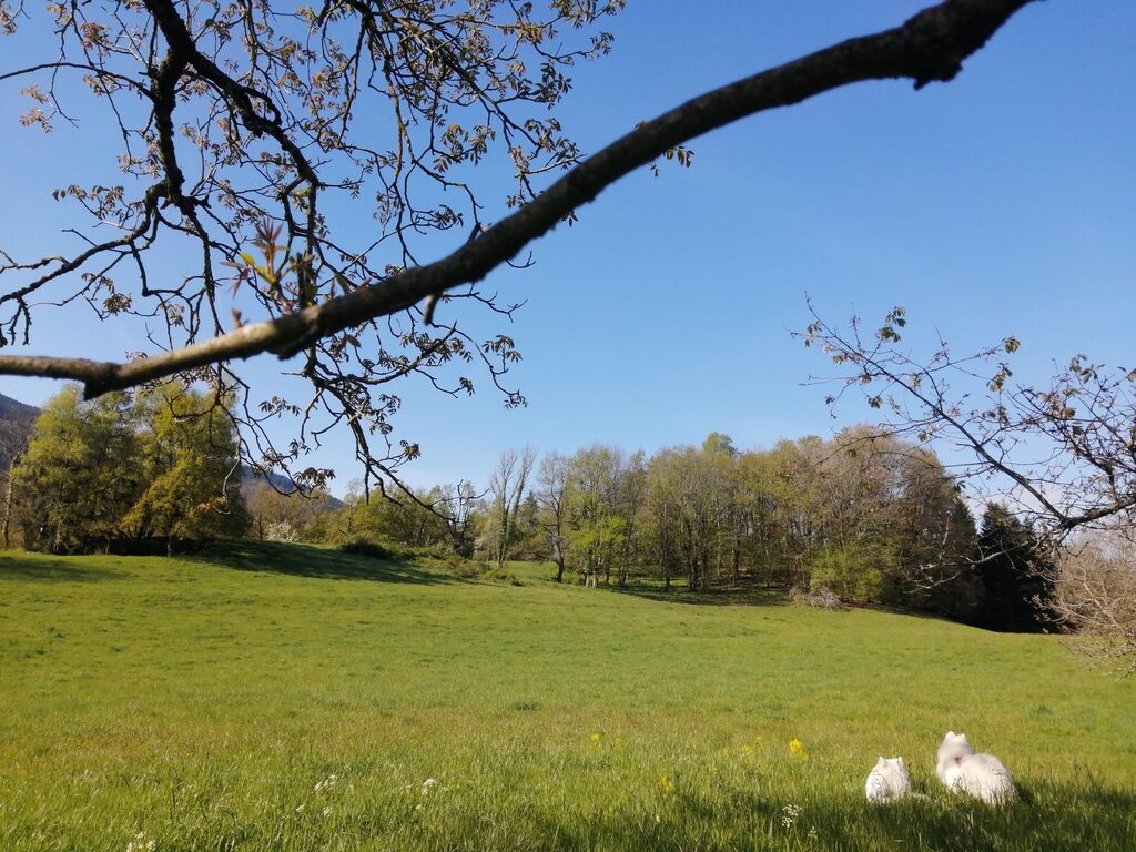 Météo de juin en ce matin d’avril, où je décide de reprendre le grand tour de l’été qui passe par La Martinette et remonte le Gelon, sans plus couper à travers champs. L’attelage bi-canin se met en route. Ombres et lumières très nettes, paysage tout rutilant, frotté, briqué, repeint à neuf. Un lézard file sur le muret, partout des hirondelles (les martinets sont arrivés dans la combe chambérienne, me dit mon père).