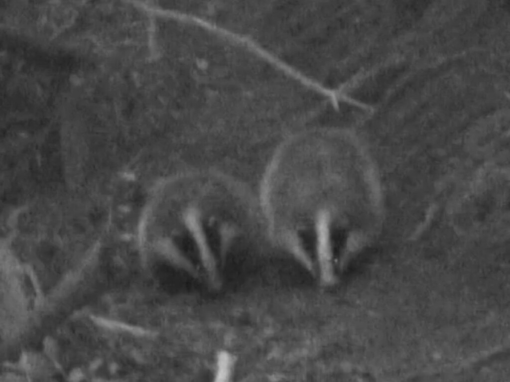 Puis soudain les voici qui dévalent vers moi, tout à leur jeu, sans prêter la moindre attention à l’humain invisible. Ils sont là, à trois mètres, deux mètres, à mes pieds. Le jeu s’arrête. Tous deux se mettent à fouiller le sol, traçant dans les feuilles mortes le trait caractéristique des blaireaux en quête de nourriture. Je les regarde passer tout près, si près, puis s’éloigner dans l’obscurité qui s’épaissit. Celui ou celle ici nommé-e Courage, s’en va vers l’inconnu (un inconnu sans doute déjà bien familier, l’espace de nourrissage); celui ou celle ici nommé-e Prudence remonte déjà vers l’esplanade, et ces deux parcours me permettent de comprendre ce qui se trame dans le hors-champ du piège photographique avec des retours toujours en décalage.