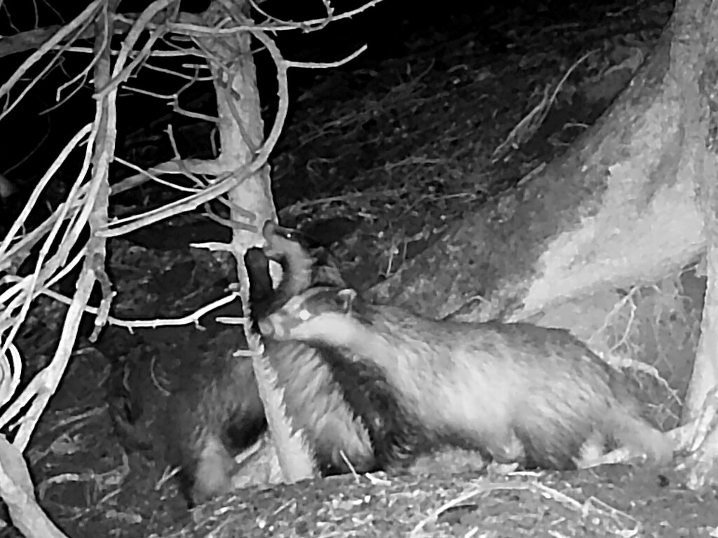 20h43, sortie des blaireautins qui reprennent leurs jeux. Courage cabriole en bascule, fait le gros dos et jette de la terre et des branchettes avec sa truffe sur Prudence, plus placide.