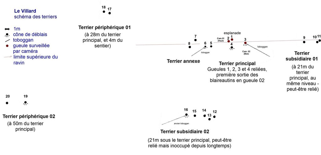 L’ensemble frappe néanmoins par sa cohérence : les deux terriers subsidiaires sont éloignés à droite, en bas et à gauche du terrier principal de 21 à 23 m, avec un sentier périphérique près du sentier qui comporte deux gueules autonomes, et un autre à cinquante mètres de là, presque en lisière du champ. Un blaireau surpris ou pourchassé sur le chemin du retour du torrent ou des prés pourrait s’y réfugier.