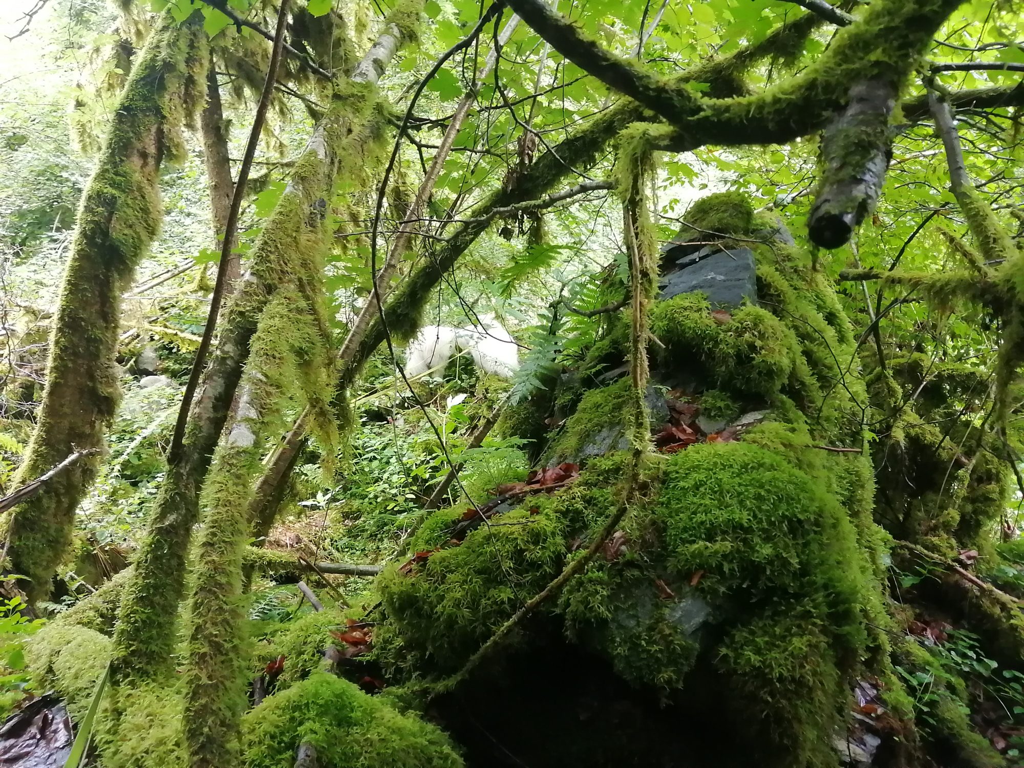 Je rejoins l’une des nombreuses « autoroutes » qui descendent vers le torrent, cherchant sur la terre de nouveau bien humide les empreintes caractéristiques des (quasi) plantigrades. Une lumière presque pourpre éclaire soudain un chablis cerné de ronces à l’entrée duquel un tronc brisé verticalement dont le bois fendu laisse pendre les fibres en bouquet comme des lianes, réveille des souvenirs de palmier counana en Guyane. Le lieu est mystérieux, on ne serait pas étonné d’y faire une rencontre – mais rien de plus ne se passe.
