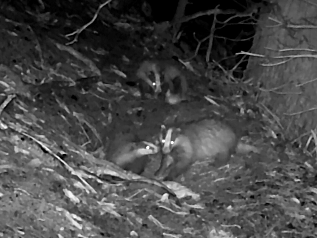 21h29, un blaireautin, sans doute Courage, arrive sur la gauche, depuis le chemin, ayant suivi sa mère à l’odeur. Avec un petit trot bondissant il dépasse la gueule 1, fait demi-tour, s’ébroue, puis passe devant le terrier sans se préoccuper de Vara qui est en train d’en sortir de la terre à reculons. Courage s’installe au-dessus d’elle, puis juste derrière, et fait sa toilette. Il part ensuite visiter la gueule 3, celle de sa première sortie…