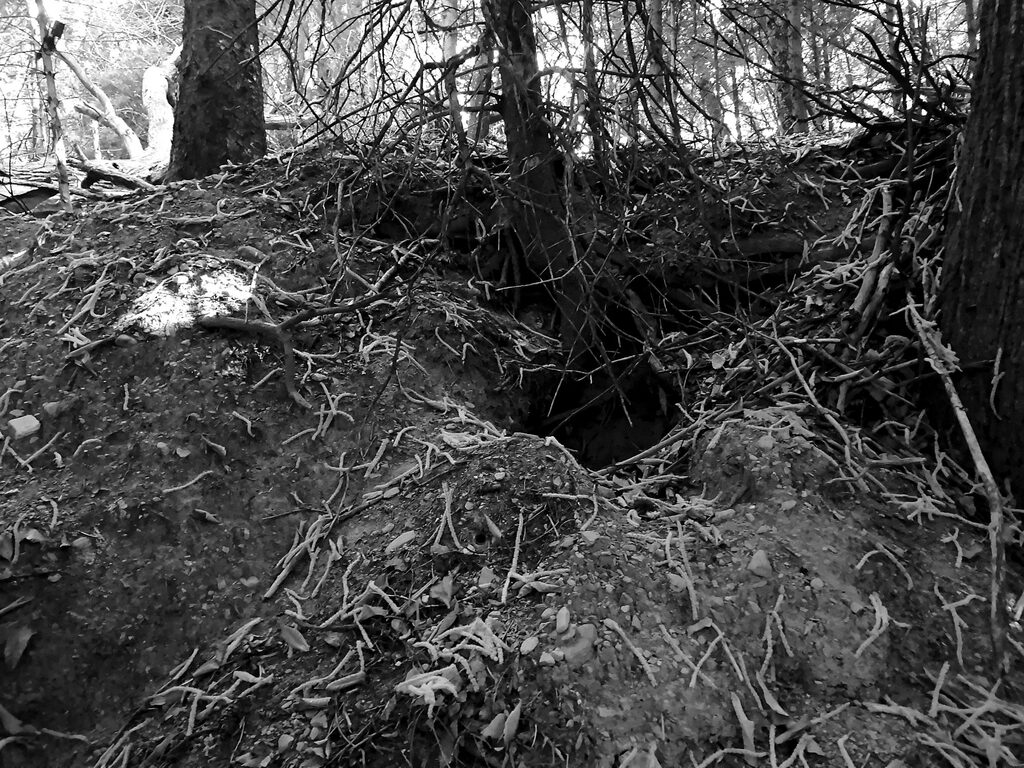 Une hulotte passe, silhouette en fuite entre les troncs. On n’entend aucun chant d’insecte ou d’oiseau, seulement au loin les clarines des vaches et parfois le fracas d’un moteur sur la D207. Le faisceau de la lampe éclaire la seule sente sur laquelle je veux concentrer mon attention. De jour, on a tendance à suivre toujours les mêmes itinéraires, quand on n’est pas attaché à des chiens qui, eux, suivent leurs pistes d’odeurs ; de nuit c’est autre chose, et en suivant la trace je dévie, je contourne des buissons que je ne reconnais pas, et j’arrive soudain devant un toboggan, un cône de remblais, un terrier inconnu (celui qui, sur le plan ci-après, est désigné comme étant le « terrier subsidiaire 02 »).